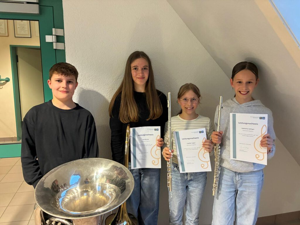 Wir gratulieren unseren vier engagierten Jungmusikern herzlich zum erfolgreichen Abschluss des Musikleistungsabzeichen D1 in Bronze. Dieser anspruchsvolle Lehrgang umfasst sowohl theoretisch als auch praktischer Bestandsteile der Musikausbildung und verlangt den Teilnehmerinnen und Teilnehmer einiges an Fleiß und Einsatz ab. Umso mehr freuen wir uns über diese tolle Leistung. Wir sind sehr stolz auf euch und hoffen, dass ihr auch in Zukunft mit viel Freude und Begeisterung musizieren werdet.